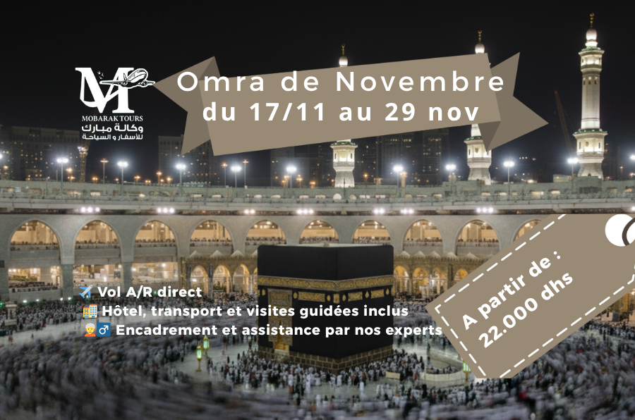 OMRA à partir de 22.000 DHS en toute sérénité avec MobarakTours.ma – Parce que chaque voyage mérite la baraka.